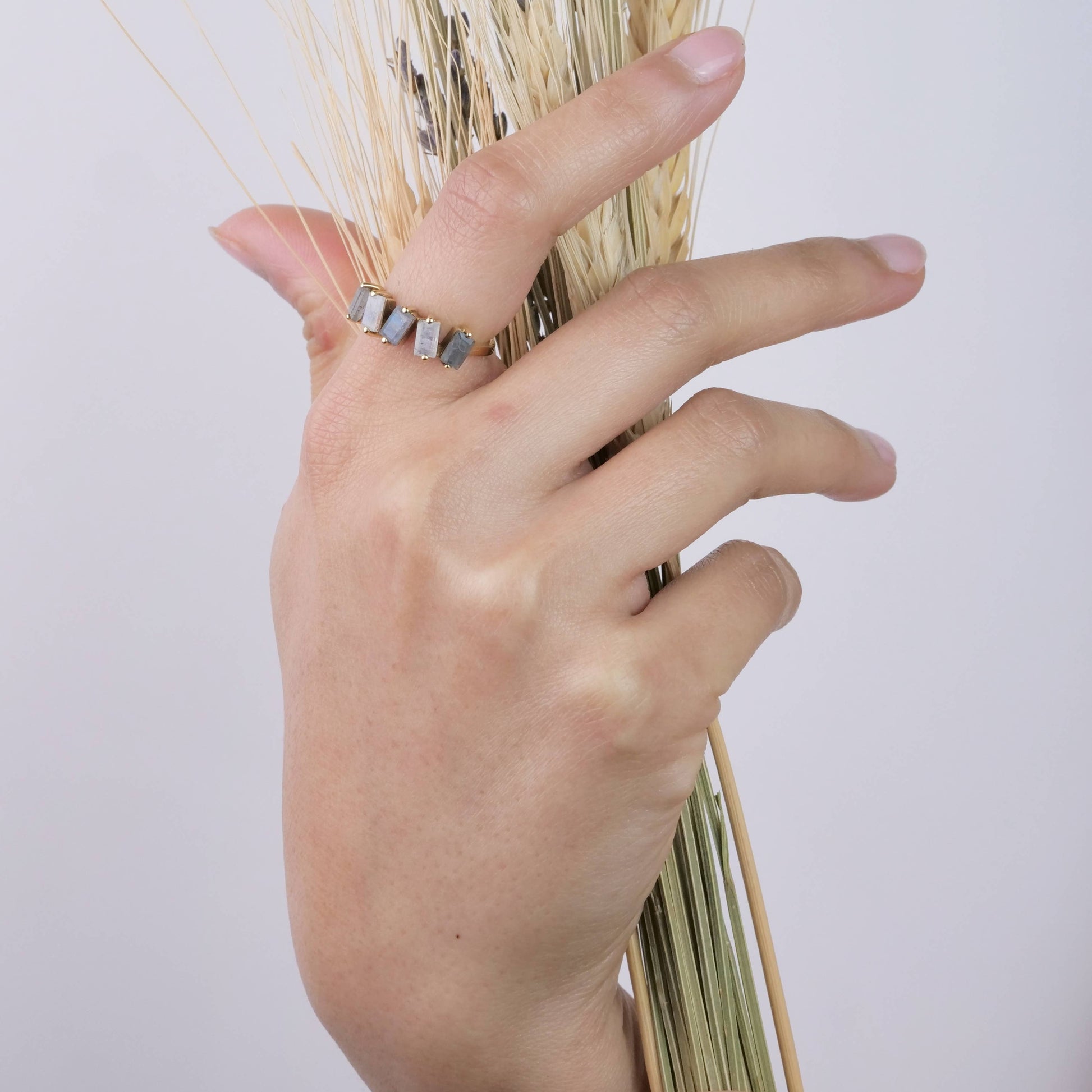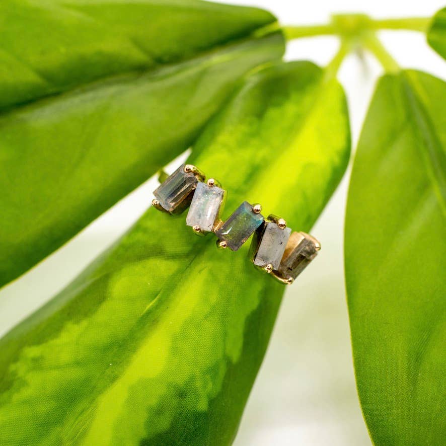 Brass ring featuring zig zag faceted moonstone and labradorite, available in size 5-10.
